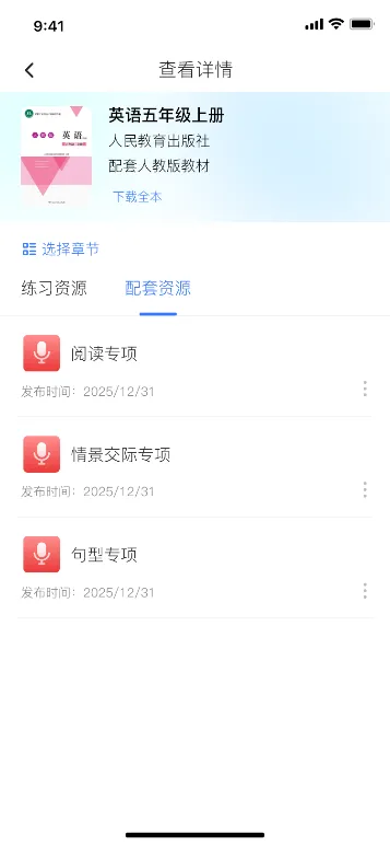 学生点击“查看详情”进入基础性作业资源页面。该页面集中展示本教辅的基础性作业资源,学生可自主查阅整本教辅或某章节练习资源。