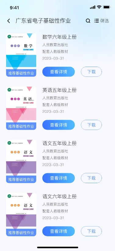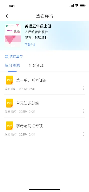 学生点击“查看详情”进入基础性作业资源页面。该页面集中展示本教辅的基础性作业资源,学生可自主查阅整本教辅或某章节练习资源。