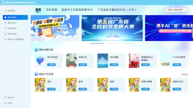 PC端介绍:教师登录平台后,进入资源中心点击“广东省电子基础性作业(小学)”(以下简称“基础性作业”)入口。