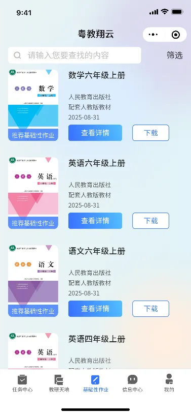 师生在粤教翔云数字教材应用平台(以下简称“平台”)官网“应用下载”中选择教师身份(windows端/小程序端)或学生身份(windows端/安卓端/iOS端/小程序端)后,可下载安装所需客户端。登录客户端后,即可在“广东省电子基础性作业(小学)”(以下简称“基础性作业”)中获得包含语文、数学、英语三个科目的全部基础性作业。
