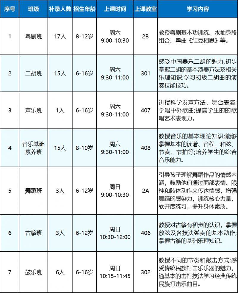 少儿班秋季补招班级汇总表