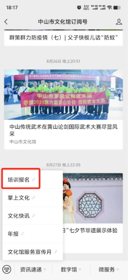 另外,大家也可以进入“中山市文化馆订阅号”公众号,点击底部菜单栏里的 “资讯速递 - 培训报名”,进行报名。
