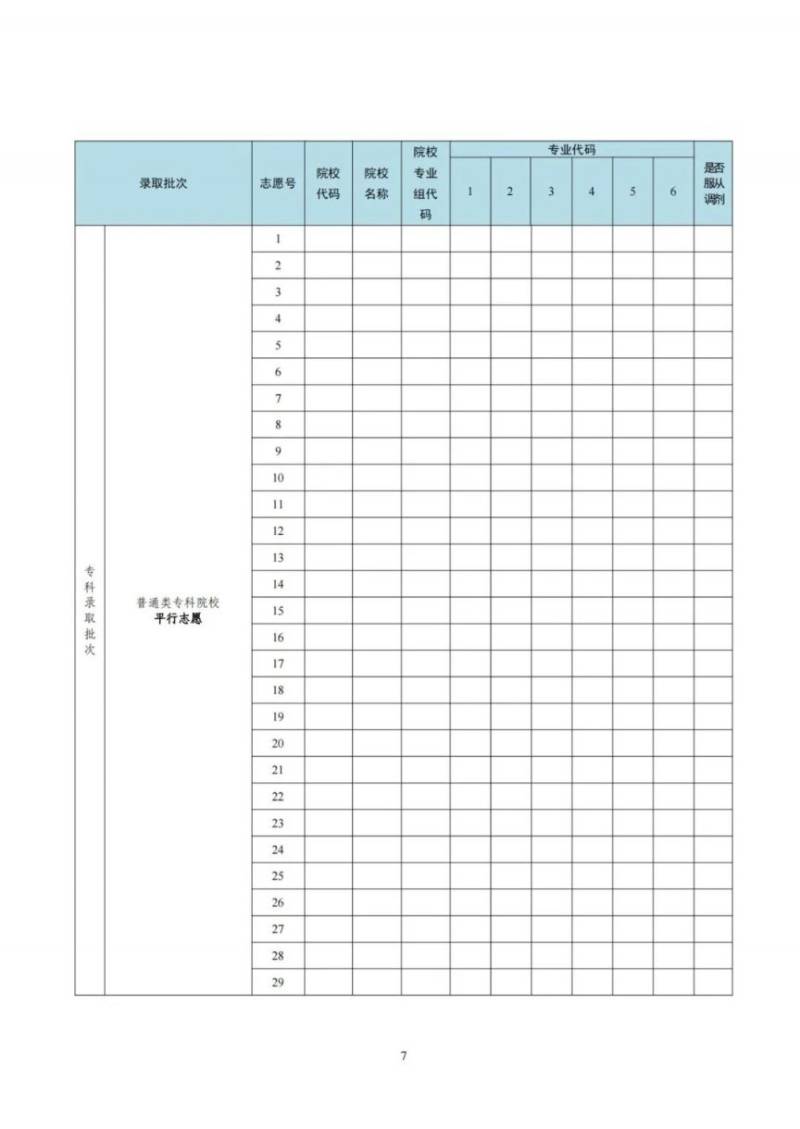 1.专科批次普通类(历史、物理)可填报45个院校专业组志愿,每个院校可填报6个专业志愿及1个是否服从调剂选项;体育类、艺术类可填报20个院校专业组志愿,每个院校可填报6个专业志愿及1个是否服从调剂选项。