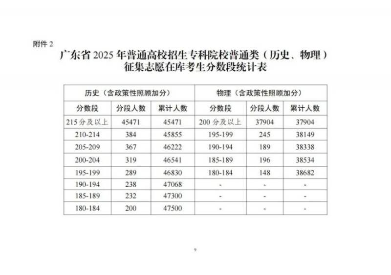 2.广东省2025年普通高校招生专科院校普通类(历史、物理)征集志愿在库考生分数段统计表