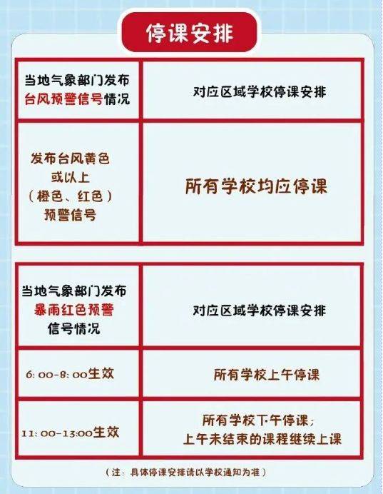 根据《广东省气象灾害防御条例》,当气象部门发布台风黄色预警信号、台风橙色预警信号、台风红色预警信号、暴雨红色预警信号可视为停课信号。生效期间,托儿所、幼儿园、中小学校中等职业学校应当停课。
