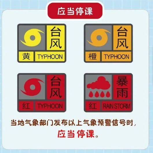 根据《广东省气象灾害防御条例》,当气象部门发布台风黄色预警信号、台风橙色预警信号、台风红色预警信号、暴雨红色预警信号可视为停课信号。生效期间,托儿所、幼儿园、中小学校中等职业学校应当停课。