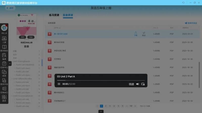 教师点击配套资源进入,可直接进入基础性配套资源页面。该页面集中展示本教辅配套的音视频资源,教师可通过章节目录快速筛选后,可自主查阅、下载对应配套资源。