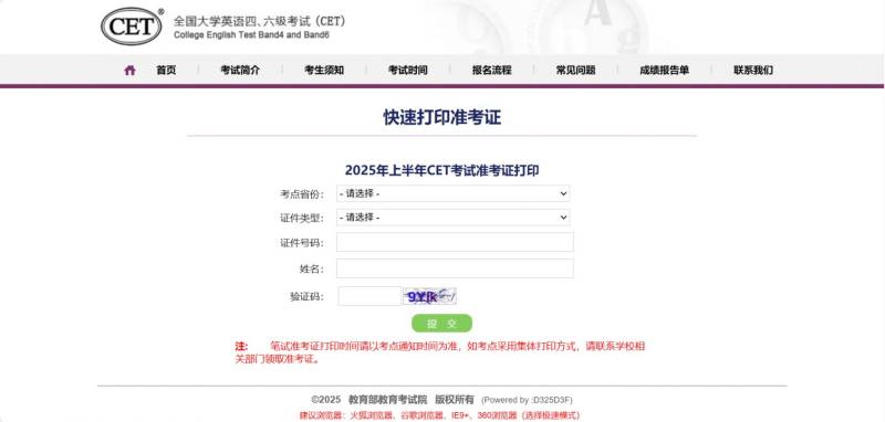 第一步:打开全国大学英语四、六级考试报名网站(http://cet-bm.neea.edu.cn),点击“快速打印准考证”。