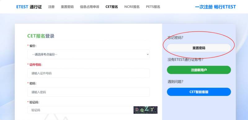 如果忘记了报名时的通行证账号,或登录后发现通行证账号非报名时的账号,可通过“重置密码”方式找回。打开全国大学英语四、六级考试报名网站(http://cet-bm.neea.edu.cn),点击“进入报名”——“重置密码”。