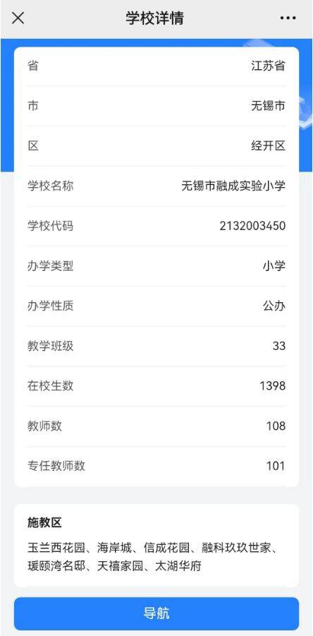 点击底部学校名称,即可出现学校的简介(学校性质、人数、施教区等)
