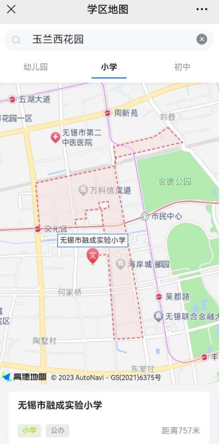 3、在搜索框输入小区名称,以“玉兰西花园”为例,即可出现对应的学区小学