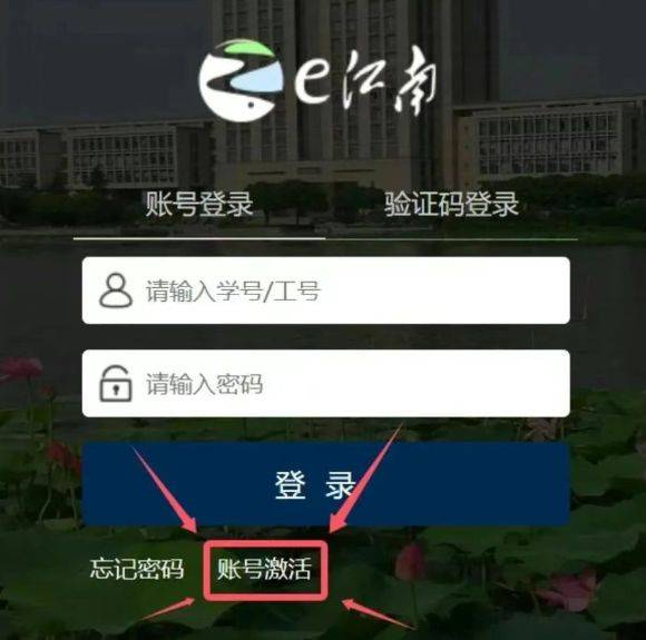 单击“账号激活”,按照提示输入录取通知书号、姓名等信息。注意:激活成功后,e江南账号即为学号。