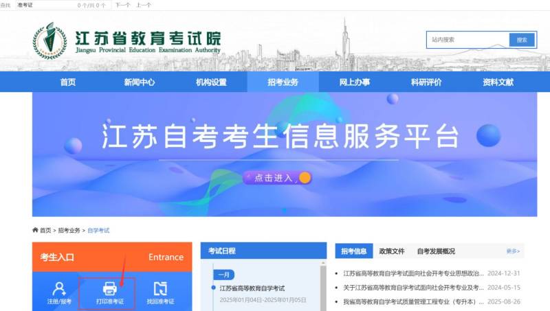 2025年10月江苏自考准考证打印入口:江苏省教育考试院网站(www.jseea.cn)“招考业务”栏目“自学考试”页面。