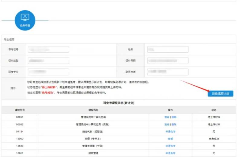 (四)2024年7月前已注册成功的考生可选择按原计划或新计划进行免考申请(默认显示新计划,可点击按钮进行计划版本的切换)(见图1)
