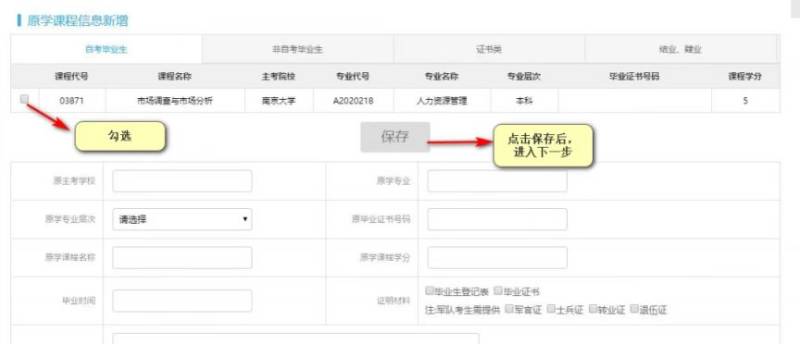 (六)使用本人江苏自考已毕业课程成绩用于申请免考的,可点击“自考毕业生”,如出现可勾选课程用于免考申请的(见图4),须勾选后再点击保存。