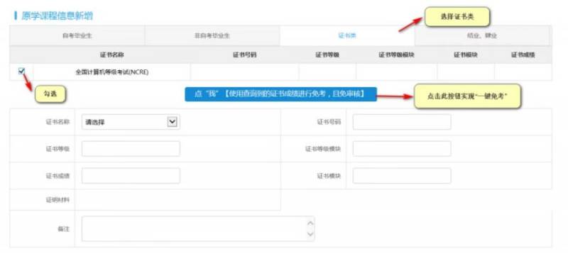 2.选择证书类→勾选出现的信息→勾选后点击蓝色按钮(见图3)→直接得到免考审核结果。
