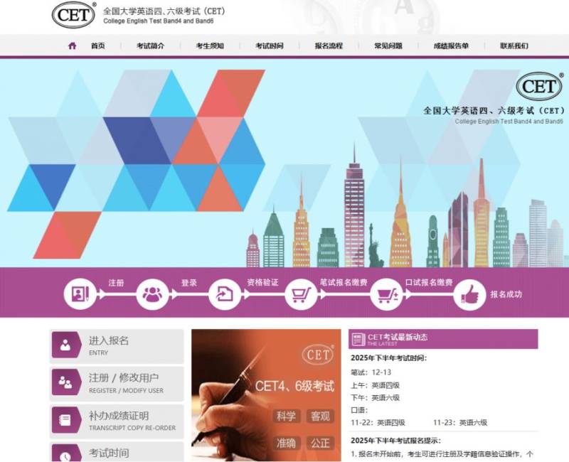 江苏省报名时间为9月15日12:00至9月21日17:00,各考点学校将在此时间段内自行选择报名系统开放时间及开考科目,请考生注意所在学校报名通知,并在规定时间登录CET全国网上报名系统(https://cet-bm.neea.edu.cn/)完成资格审核、笔试及口试报名缴费。如口试和笔试兼报,应先报笔试再报口试。