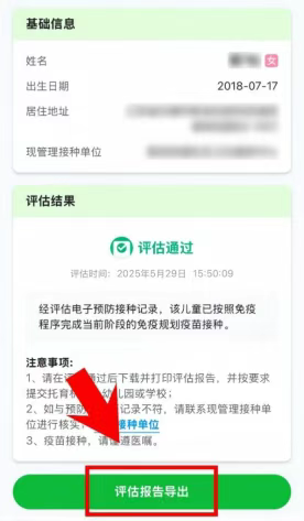 3.导出评估报告:进入儿童疫苗界面,依次点击【入学入托】→【评估报告导出】,选择PDF格式下载保存。
