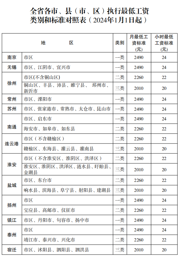 根据《最低工资规定》(原劳动保障部令第21号)和《江苏省工资支付条例》规定,经省人民政府同意,从2024年1月1日起调整全省最低工资标准。现就有关事项通知如下: