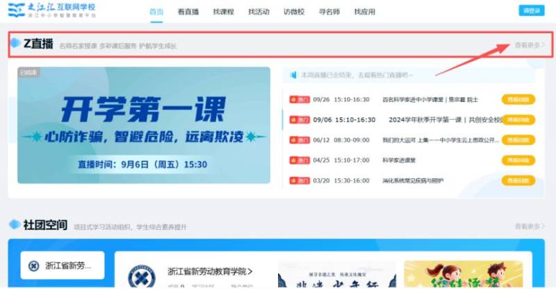 在校收看平台:教师可使用教室内电脑,搜索进入之江汇互联网学校(浙江中小学智慧教育平台)“Z直播”应用(www.zjer.cn),选择“浙江开学第一课”播出时间“9月1日”,即可找到对应课程入口。