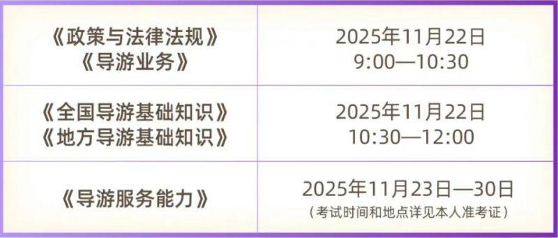 2025年11月17日9:00起,考生可通过网址(https://mr.mct.gov.cn)或“文旅之声”微信公众号登录全国导游资格考试网上报名系统下载准考证并自行打印。报名信息审核未通过或未交费的考生,无法下载准考证。