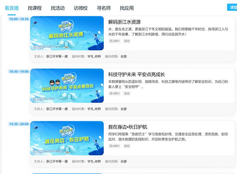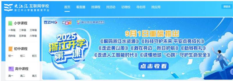 教师可使用教室内电脑,搜索进入之江汇互联网学校(浙江中小学智慧教育平台)“Z直播”应用(www.zjer.cn),选择“浙江开学第一课”播出时间“9月1日”,即可找到对应课程入口。
