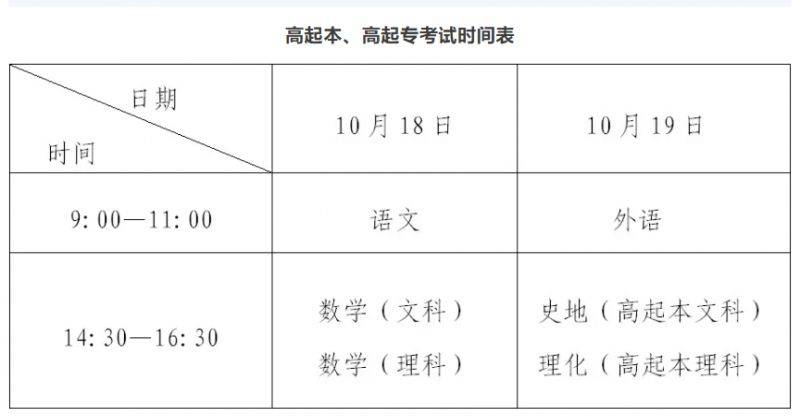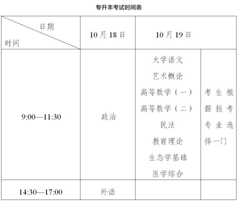 专升本、高起本和高起专外语考试科目分为英语、日语两个语种,考生可根据高校招生章程公布的专业要求选择一种。高校艺术、体育类专业须进行专业加试,其他专业是否进行专业加试由各招生院校自行确定。高起本和高起专的艺术类考生需参加数学考试,数学成绩不计入总分,供招生院校录取时参考。