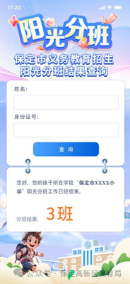 在“阳光分班”页面输入学生姓名和身份证号即可查看分班结果。