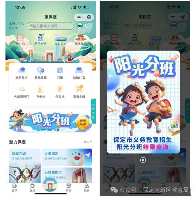 家长可通过下载“惠保定”APP或搜索“惠保定服务平台”微信小程序,点击首页“阳光分班”弹窗图或轮播图,进入页面按要求进行填写后查询分班结果。