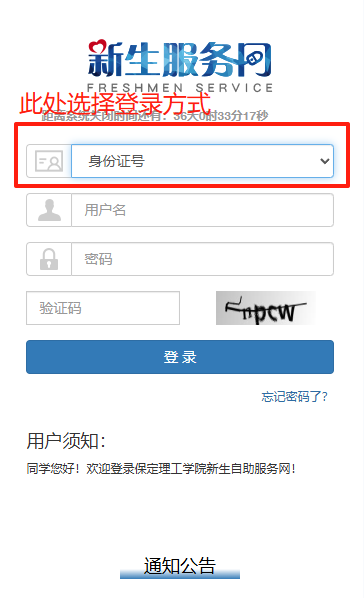 扫描上方二维码或进入保定理工学院公众号后点击学生服务-》新生服务进入新生服务系统,可选择身份证号或考生号作为用户名进行登录,以身份证后6位作为默认密码: