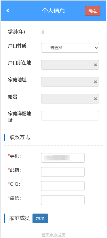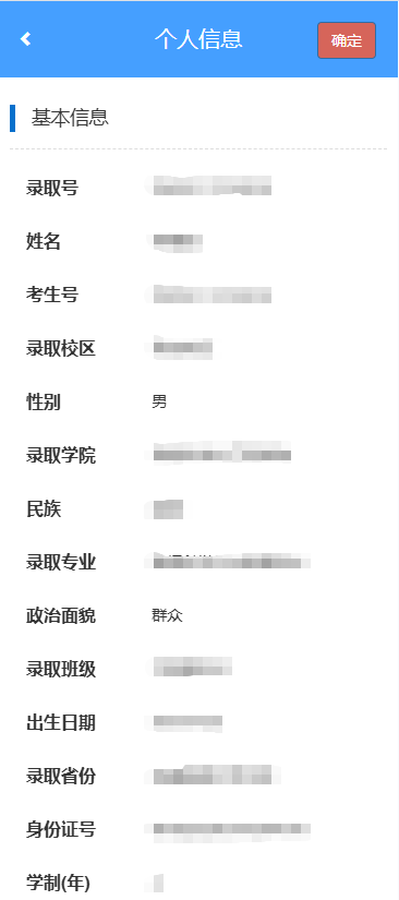 确认您的个人信息是否与本人一致,补充个人其他信息,字段名称左侧标红色*为必填字段,填写完成后点击右上方确定按钮完成该流程。