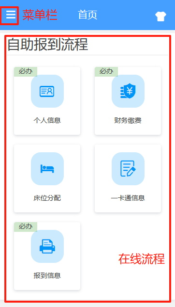 进入系统后,在首页将展示当前待办理的流程信息和菜单栏,您可以点击在线流程红框内对应的流程进入办理,左上方有必办字样的代表该流程您必须办理,有已办理字样代表已经完成该流程办理,无字样代表该流程可选办理;点击左上方按钮可以展示菜单栏。