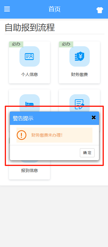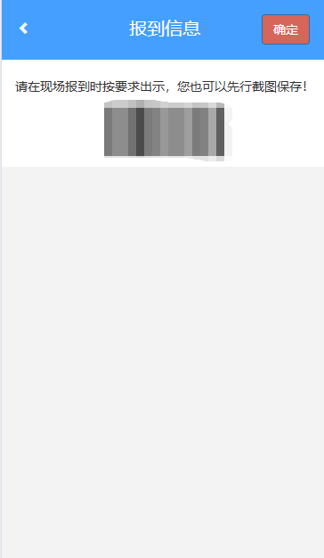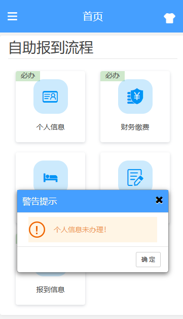 此处将展示您的报到条形码,您可以在现场报到时出示该条形码验证信息(您也可以先行截图保存该条形码,请务必妥善保存),在进行该项流程之前,您需要先完成个人信息流程,否则会显示以下提示,在正常展示条形码后点击右上方确定按钮完成流程。