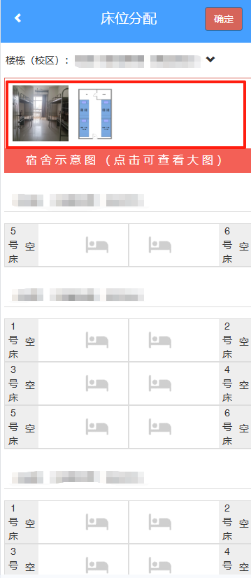 在选择床位时,可以查看宿舍的示意图和平面图确定床号,选中想要的床位后,点击确定即可完成办理(床位选择后不可撤销,如需更换床位需要在现场报到时提出更换要求)。