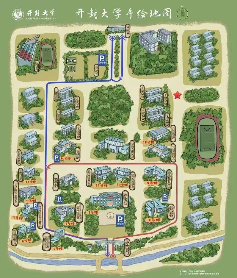 各位新生及家长可从开封大学南门或北门进入校园,沿红色与蓝色指引线前行,校内设有多个停车点,具体位置已在地图中标注,方便大家停车使用。