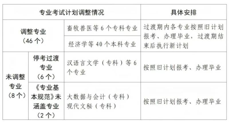 当前我省开考共54个专业,本次调整46个专业,未调整专业8个,其中停考过渡专业6个,《高等教育自学考试专业基本规范(2021年)》(以下简称《专业基本规范》)未涵盖专业2个,具体安排见下表。