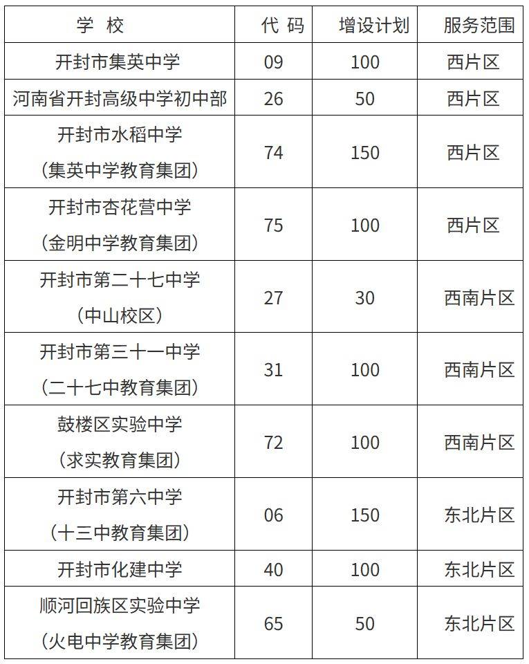 开封市教育体育局关于调整增加部分片区初中学校招生计划的公告