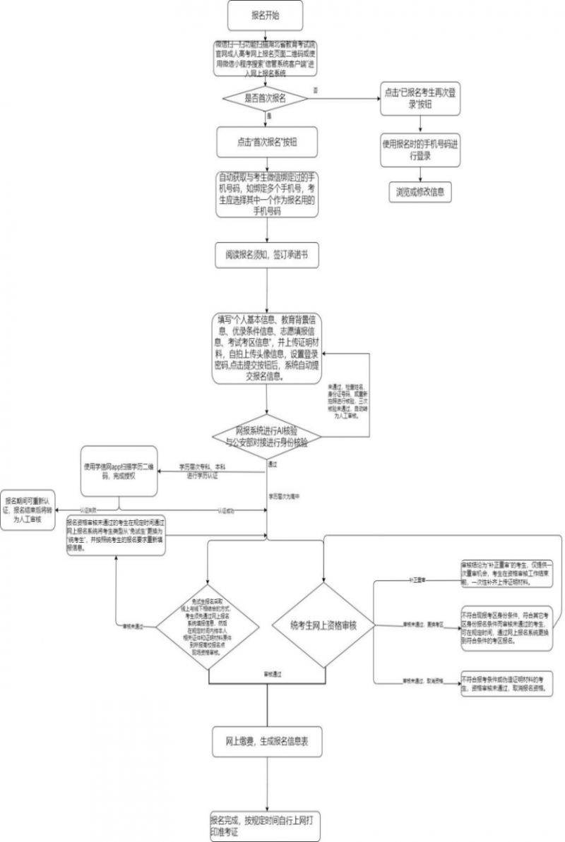 5.报名信息提交成功后,网上报名系统才将该考生的报名信息作为有效信息进行保存,报名信息提交成功是指考生身份信息已通过线上身份自动核验或转为人工身份核验。线上身份自动核验未通过的考生,网上报名系统会反馈核验未通过的原因,显示两个按钮:“返回重新修正和核验信息”“终止报名退出系统”。如考生点击“返回重新修正和核验信息”按钮,可在2小时内重新修正身份证号或姓名,以及自拍上传头像照片,再次提交信息接受线上身份自动核验,如再次核验仍未通过,考生可重复上述操作进行第三次线上身份核验,如2小时内3次重复提交信息后核验仍未通过,网上报名系统会提示“请考生确认,自拍上传的头像照片是否确为本人头像,是否申请转为线上人工身份核验”,如果考生点击“是”,网上报名系统会自动将考生身份核验转为线上人工身份核验,如果点击“否”,网上报名系统会退出报名页面终止考生继续操作。如考生点击“终止报名退出系统”按钮,网上报名系统也会退出报名页面终止考生继续操作。