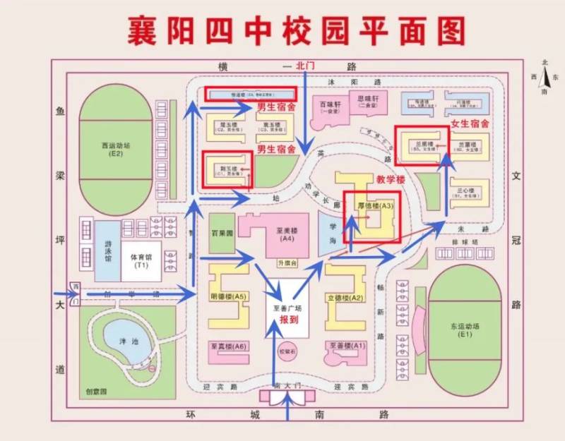 2025级高一年级教学楼为厚德楼,男生寝室为荆玉楼和悟道楼,女生寝室为兰质楼,具体位置及路线见下图: