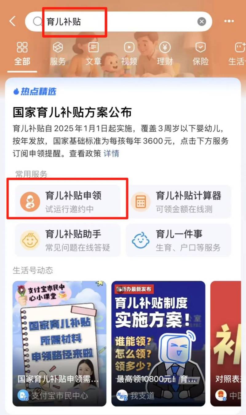 打开支付宝搜索【育儿补贴】点击下方【育儿补贴申领】