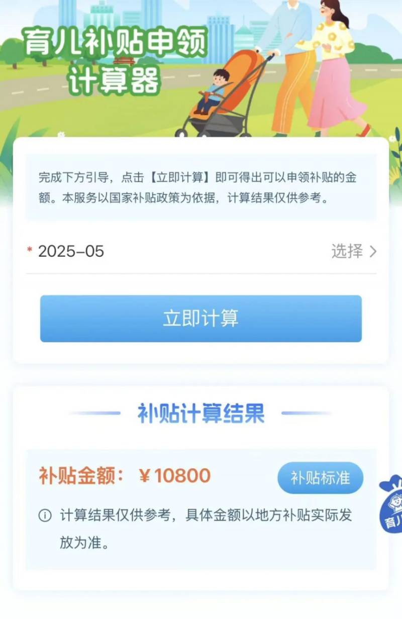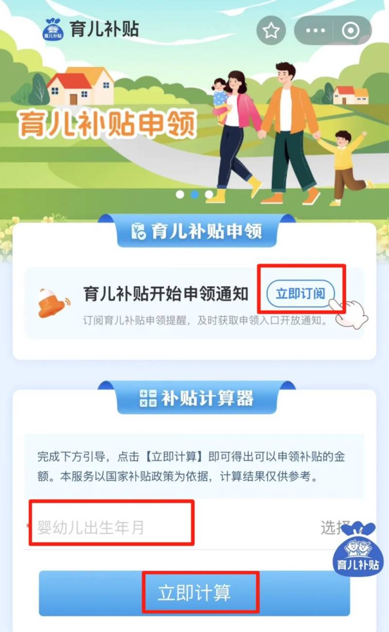 点击【立即订阅】及时获取申领入口开放通知还可以使用【补贴计算器】选择幼儿出生时间点击计算