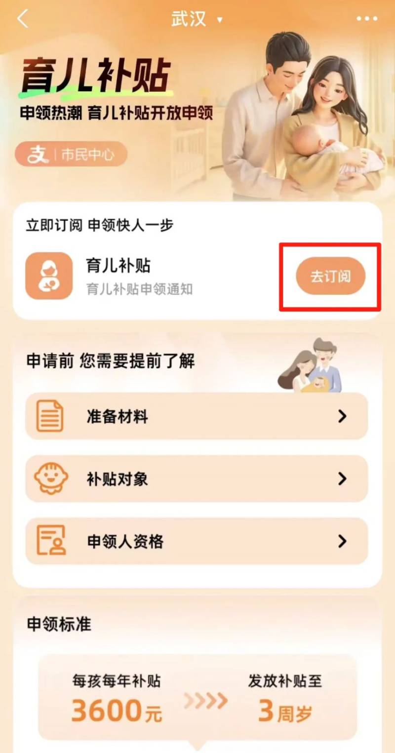 点击【育儿补贴】旁边的【去订阅】