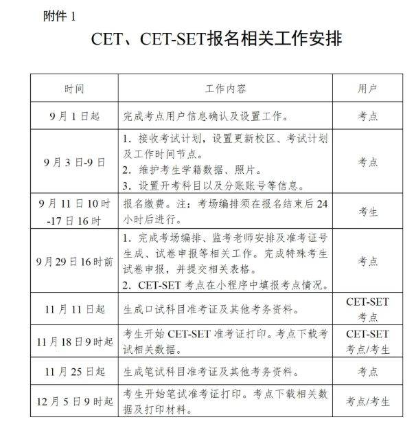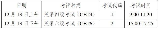 (1)CET:开考科目为英语四级和六级。考试时间具体安排如下: