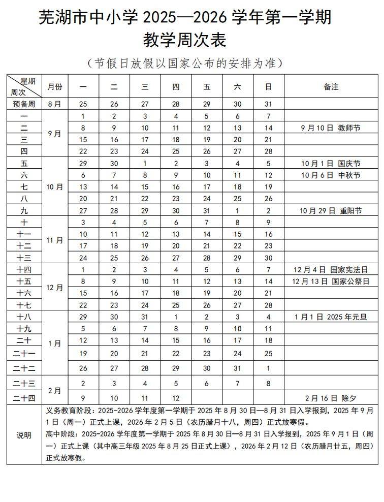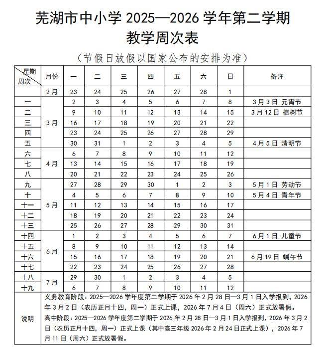 高中阶段:2025—2026学年第一学期24周次,第二学期19周次。节假日放假以国家公布的安排为准。