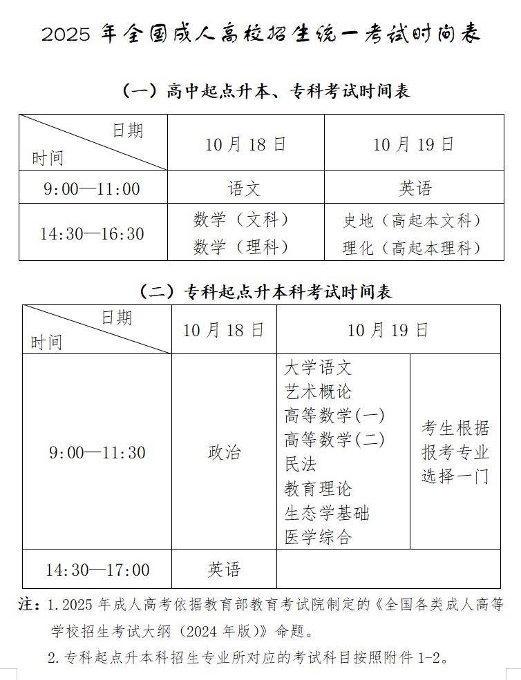 全国成人高等学校招生统一考试日期为10月18日-19日,具体时间安排如下: