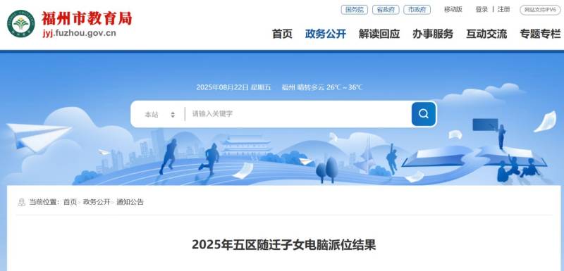 2025年8月22日,福州五城区(鼓楼、台江、晋安、仓山、马尾)对符合条件的随迁子女进行电脑派位,派位结果已经公布,大家可通过福州市教育局或榕教之窗等平台进行查询。