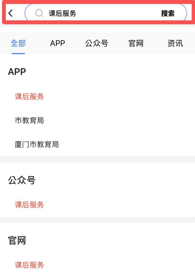 入口一:登录“ i厦门 ”APP / “厦门市民卡”APP,顶部搜索栏搜索关键词“课后服务”,进入课后服务专题页面。