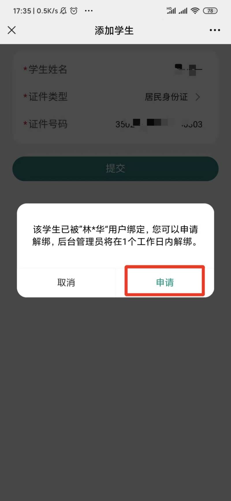 特殊情况2:如果提示该学生已被绑定,点击【申请】申请解绑,后台管理员将在1个工作日内解绑,请耐心等待。