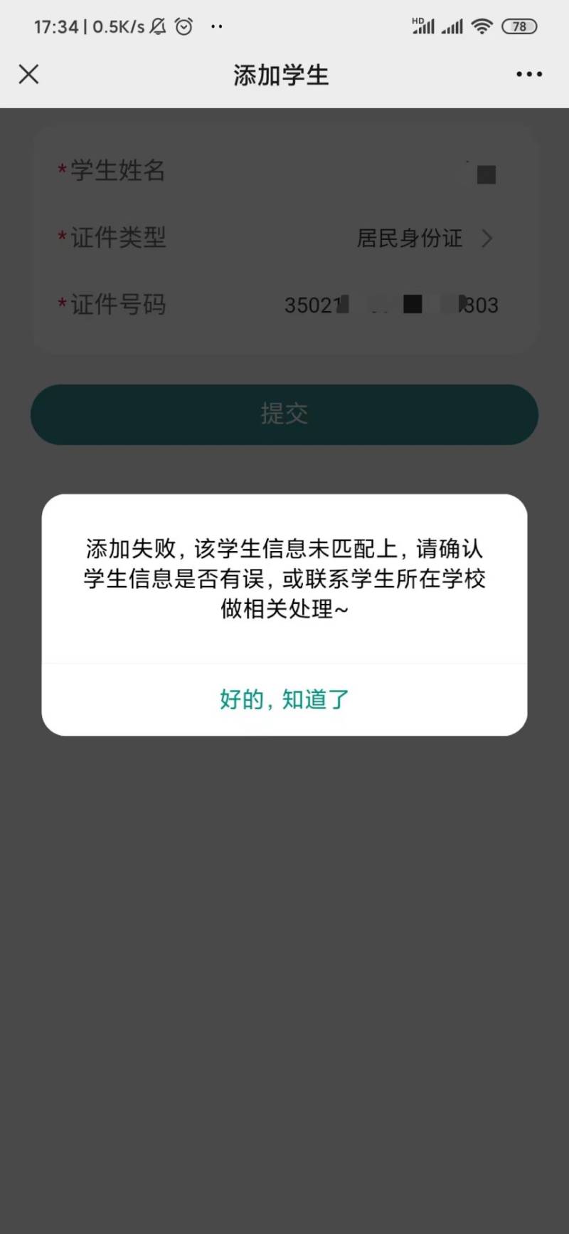 特殊情况1:如果提示添加失败,请确认填写学生信息是否有误,或联系学生所在学校处理。