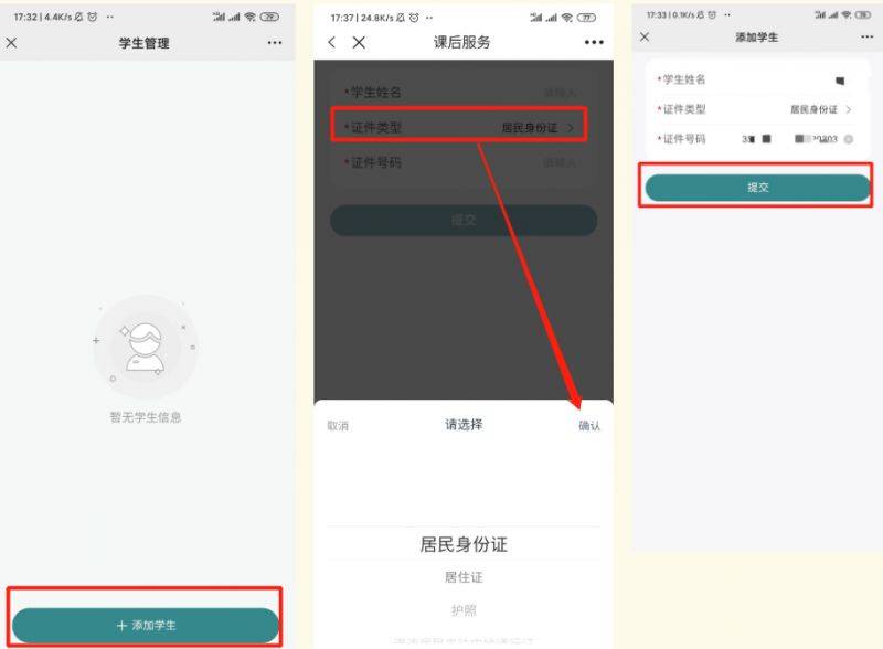 2.2 点击【添加学生】,跳转学生信息填写页面,填写学生信息,选择【证件类型】后,点击提交,若提示添加成功,可进行报名。(若已有学生信息,可忽略此步骤)